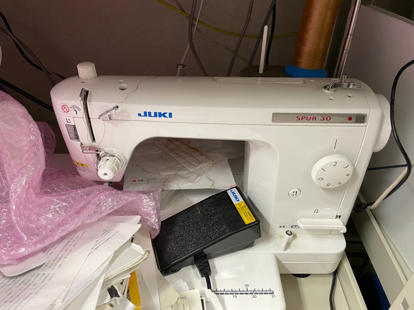 研究室にいきなりミシンを貸してほしいとやって来るのもなんですが,貸せるミシンがあるのもなんだかな,と思いますが,あるんです.これは以前パラシュート用のナイロン布にザイロンを糸として縫い付けることで部品を作ったことがあり,その時に入手したもので,当時10万円くらいしました.ミシンの使い方なんて,小学生の家庭科でやった以来ですが,それでも「多分こうだろう」という感じで使っていたらなんとかなりました.そのとき以来使っていないので,5年は使っていない.